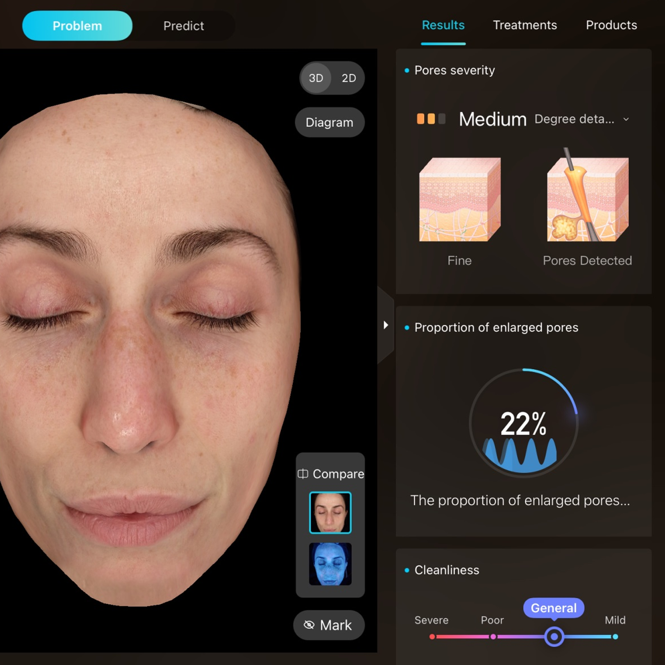 - Analyse – de software toont de huidconditie in detail en vergelijkt deze met referentiewaarden