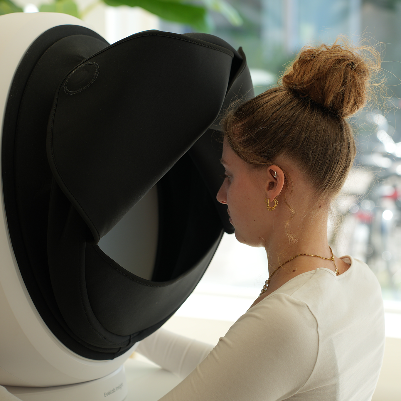 - Huidscan – je plaatst je kin en voorhoofd in het apparaat, waarna de scan in enkele seconden wordt gemaakt